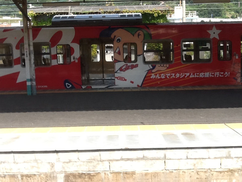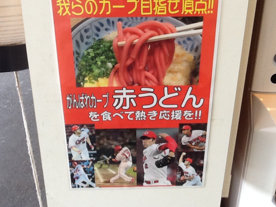 広島カープが元気なためか、カープ電車カープうどんを見かけた
