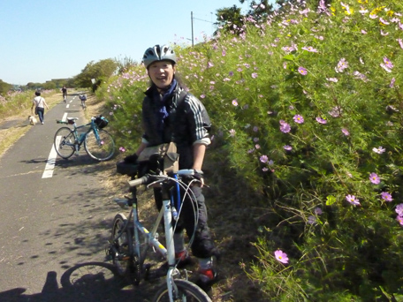 たくさんにコスモス咲く道を 気持ちよく走ります